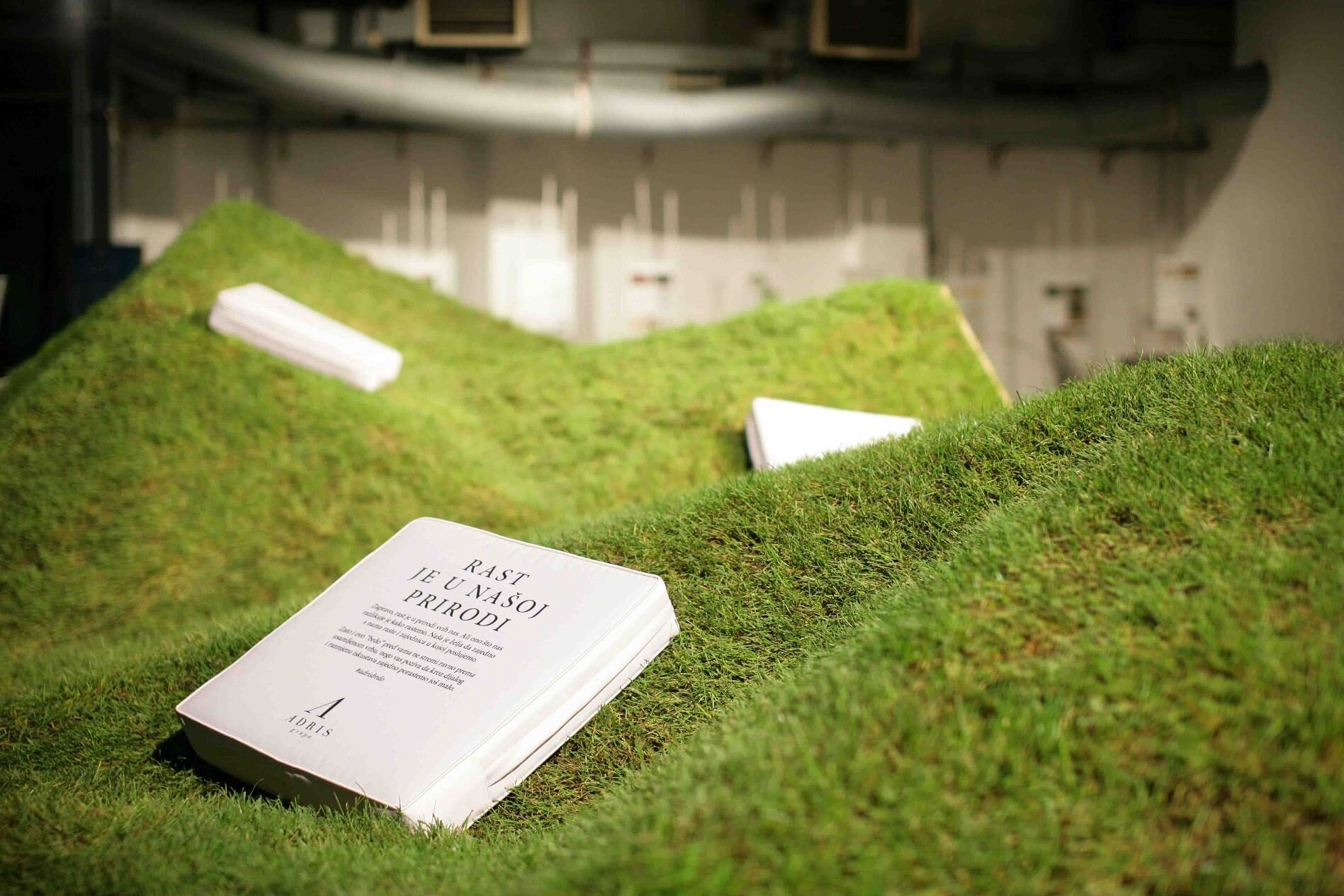 A natural ambient has been created, opposed to an unusual form around which festival visitors stopped, used it to relax, talk, work on their computers or just go through Adris corporate publications. Installation seemed so convincingly natural, even a local seagull decided to take a look and have a rest in the grass.