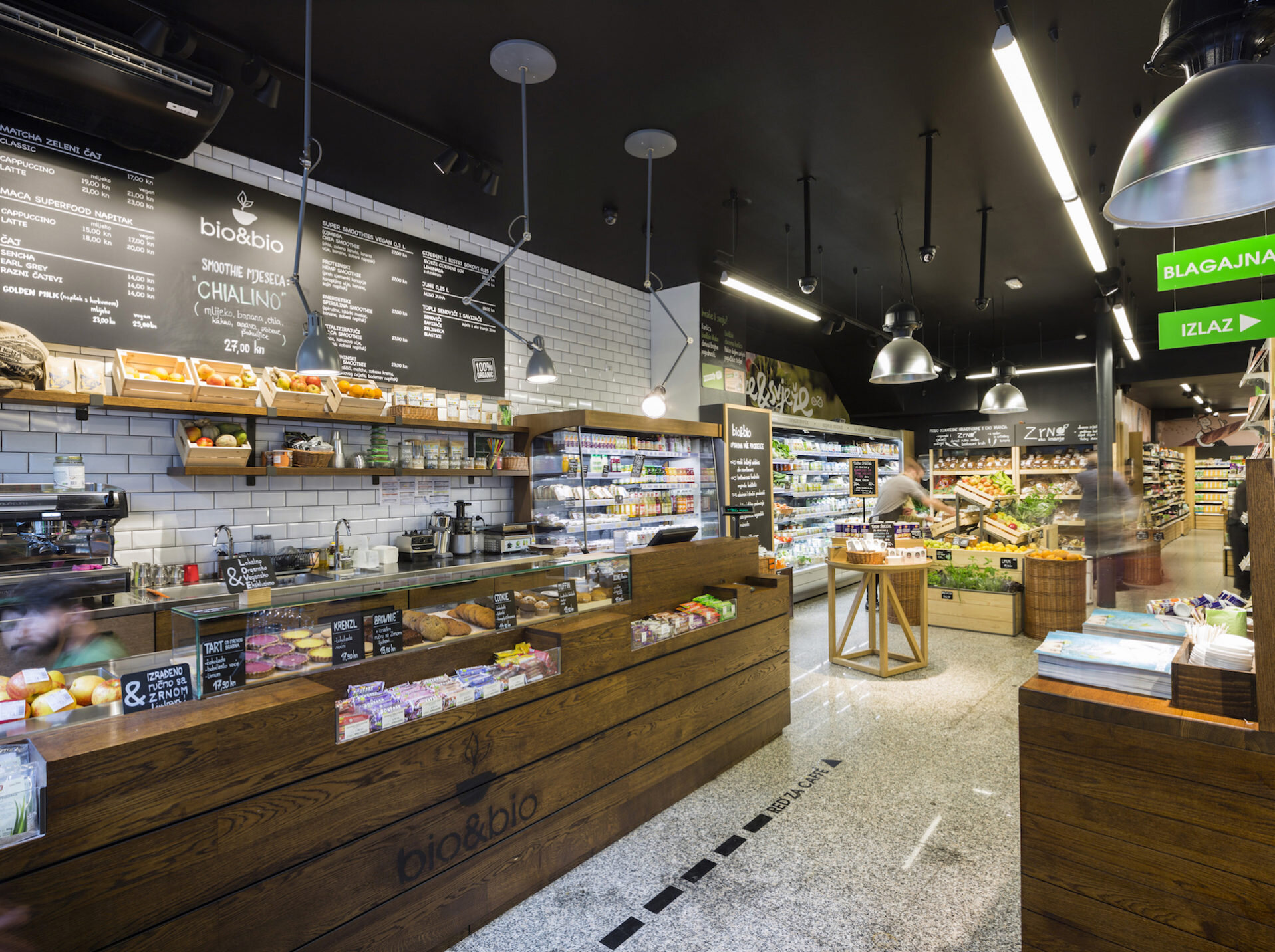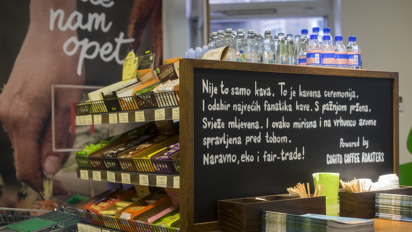 We planned the cafe section of bio&bio eco product stores in accordance to their store concept, which was created during their rebranding. The results can be seen today in stores like the one in Zagreb Oktogon, or in Super Konzum on Radnička street, where one can eat a healthy sandwich, cake, vegan delicacy from eco estate Zrno, drink a fresh made superfood smoothie or organically grown coffee.
