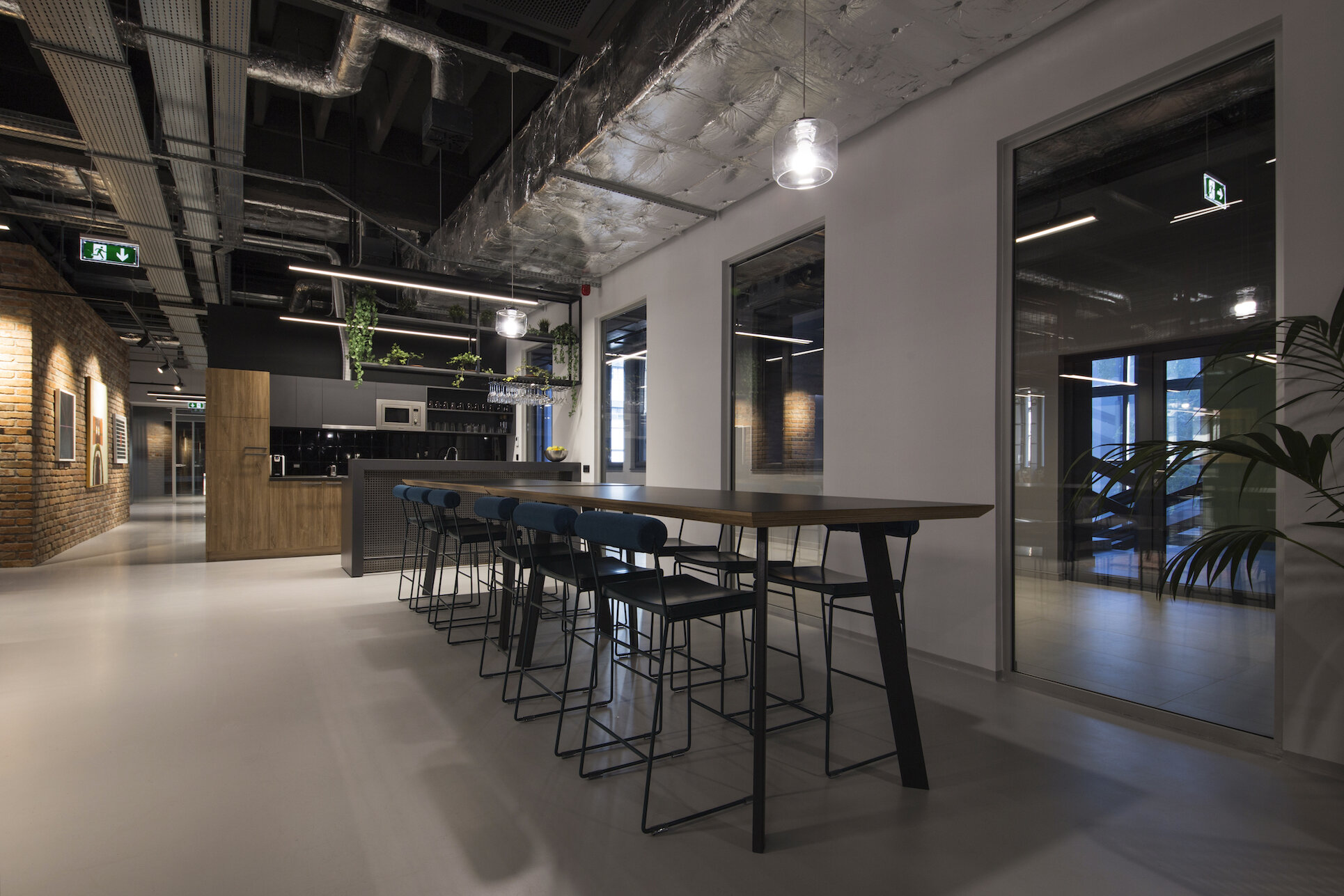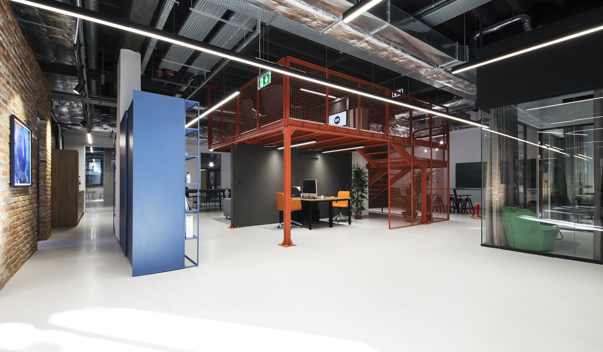 The work zone occupies the largest portion of the open floor plan, utilizing a flexible workspace organization which gives the ability to add space with an increase in employees, without affecting the quality of work or spatial experience. The final result is a modern, functional, and eclectic space that serves as a primary office, but also encourages the creation of creative and quality new ideas.