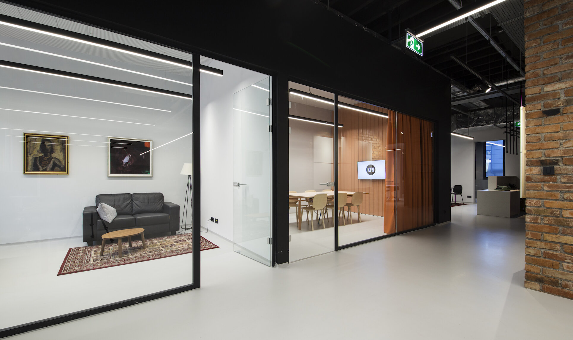 This office design takes a unique approach by blending the formal, functional aspects of traditional workspace with strong, yet subtle design moves for an overall creative and unexpected spatial identity. Kofein's primary function is to act as a pleasant workspace. However, its thoughtful spatial disposition of open and closed zoning allows it to serve as a gallery, a cinema, a coffee shop, or a place for fun and relaxation. The motif of "Kofein" has been translated into the reception desk by giving the impression of entering a boutique coffee shop, a small lounge area where people might have coffee or read a newspaper.