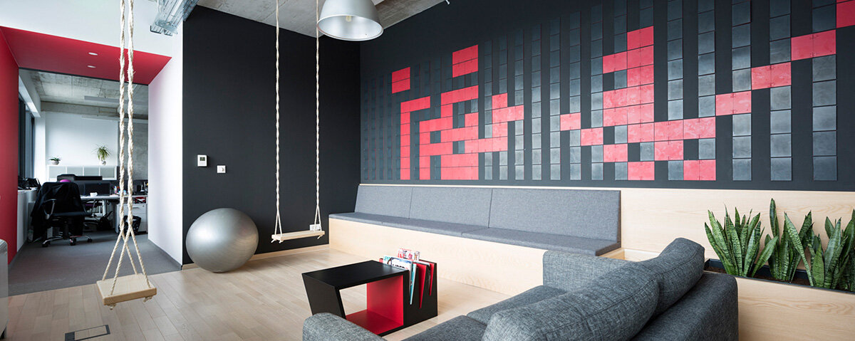 As the space was a shell construction when work began, we retained the industrial style with visible installations and bare concrete columns whose grey tones are reiterated through other elements in the office. The workspace is open, facilitating communication, while there are separate zones for rest, meetings and socialization. The largest space is the lounge, intended for brainstorming sessions and informal meetings. Here one can have a seat on a swing, bench, or ball, and the best ideas or messages can be jotted down on a wall made of modular metal plates.