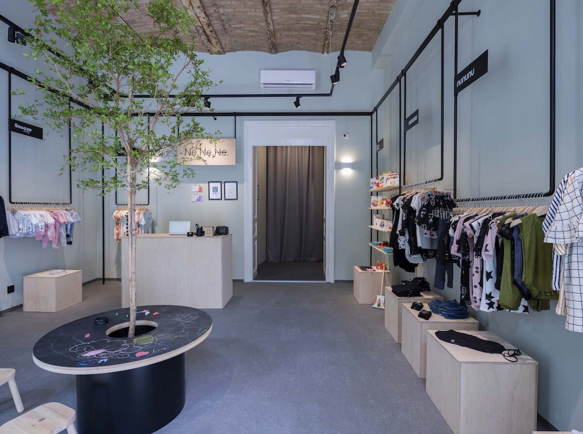 The Ne.Ne.Ne. shop was designed for “small people with great attitudes,” following the brand tag line. This shop was created in collaboration with a client who sought light construction with minimal complications.