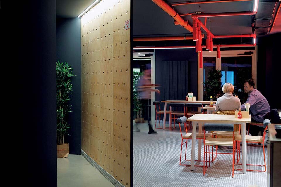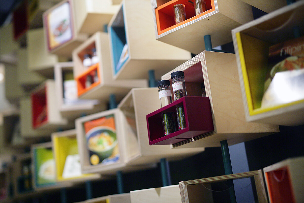 The fixtures have been intentionally left visible to create a sense of openness, a concept further enhanced by the open kitchen where guests can observe the preparation of their meals. A somewhat unexpected feature within the space is the interactive wall adorned with an array of spice boxes for guests to experiment with, along with an assortment of trinkets like board games, adding to the overall sensory experience.